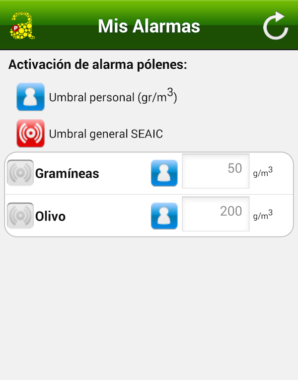 Con esta última opción, la aplicación enviará una alerta al móvil del usuario cuando los niveles de polen superen los límites establecidos por la SEAIC. Con esta información, el usuario puede adoptar las medidas preventivas que considere necesarias. También existe la posibilidad de personalizar los límites de los niveles de polen, y de que sea el propio usuario el que determine los límites si ha detectado que su sensibilidad al alérgeno se desarrolla en límites menores.