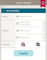 Mis controles: En esta sección el paciente podrá seleccionar el tipo de control que quiere monitorizar, pudiendo elegir entre 12 posibles, tales como test, peso, presión arterial, glucosa, etc. También se deberá configurar el calendario, las horas de los controles, así como las alarmas para no perderse ninguno de ellos.